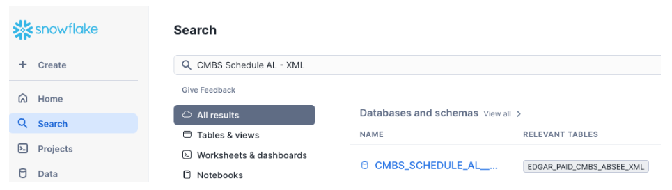 Find the dataset in the Snowflake Marketplace (left navigationan menu) using "Search" and typing: "CMBS Schedule AL - XML". It will come-up as "Free to Try".