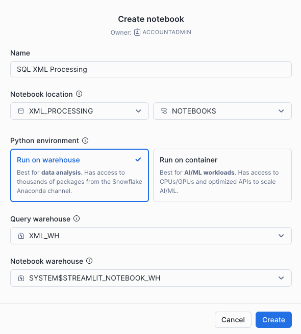 USE ROLE ACCOUNTADMIN; CREATE DATABASE IF NOT EXISTS XML_PROCESSING; USE DATABASE XML_PROCESSING; CREATE SCHEMA IF NOT EXISTS NOTEBOOKS; CREATE WAREHOUSE IF NOT EXISTS XML_WH WAREHOUSE_SIZE=XSMALL INITIALLY_SUSPENDED=TRUE; USE WAREHOUSE XML_WH; CREATE FILE FORMAT IF NOT EXISTS my_xml_format TYPE = XML COMPRESSION = NONE; CREATE STAGE IF NOT EXISTS XML_PROCESSING.DATA.XMLDATA_STAGE DIRECTORY = (ENABLE = TRUE) FILE_FORMAT = my_xml_format ENCRYPTION = (TYPE = 'SNOWFLAKE_SSE');
