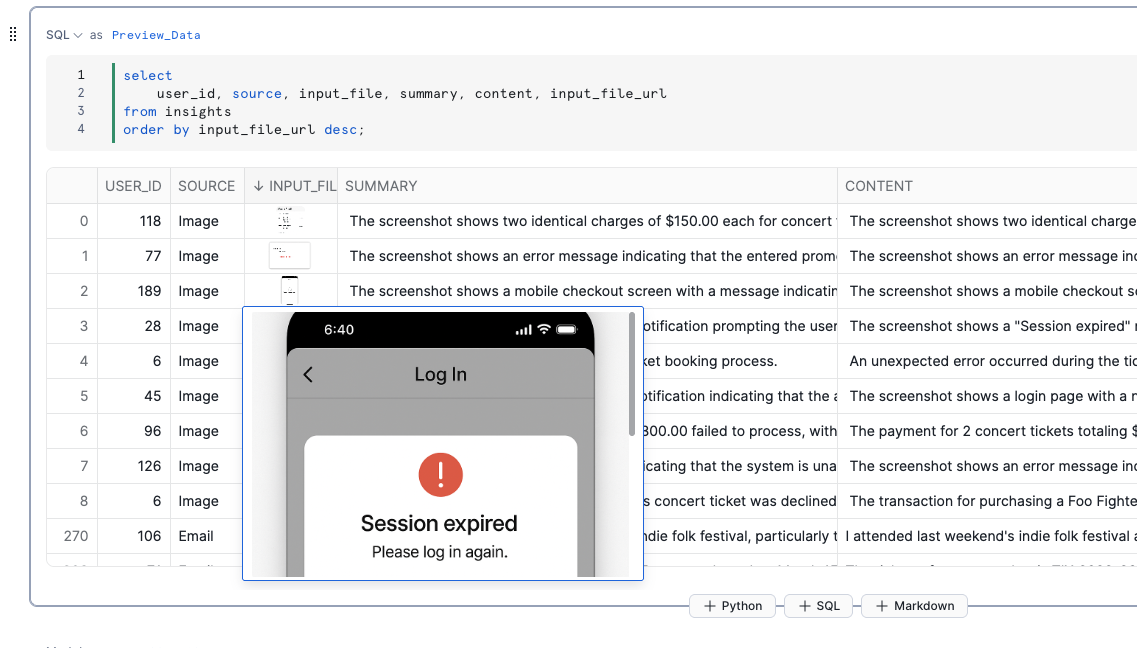AI_COMPLETE()とAI_TRANSCRIBE()を使用して、テキスト、画像、音声データにわたる顧客の問題を特定し、SQLオペレーターがすべてのモダリティでシームレスに機能する様子を確認します。