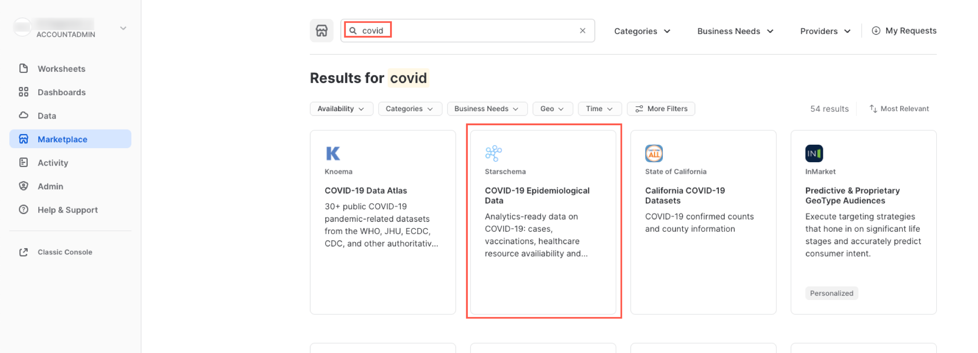 検索ボックスに「COVID」と入力し、結果をスクロールしてCOVID-19疫学データ(提供:Starschema)を選択します。