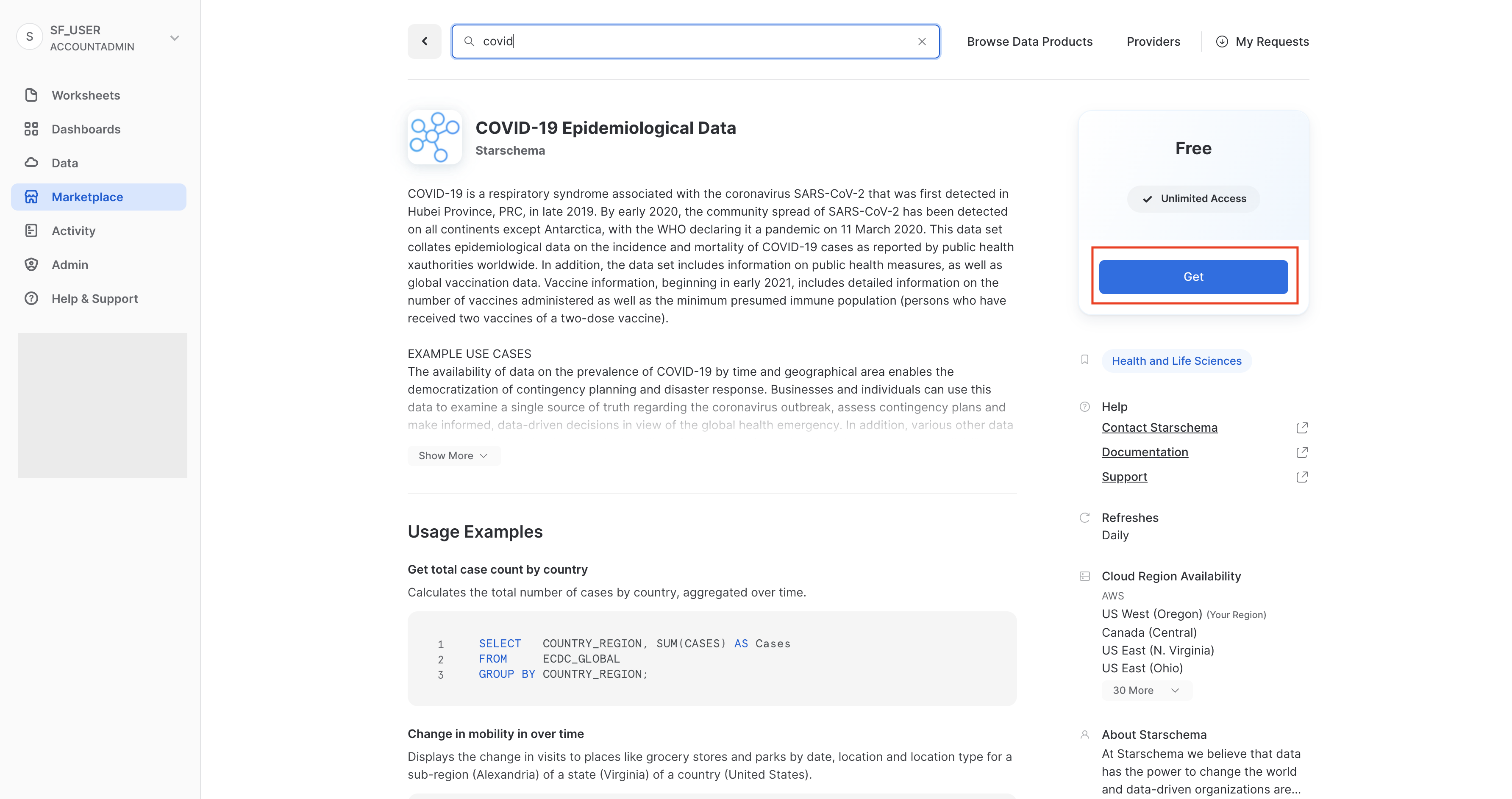 COVID-19疫学データのページでは、データセットの詳細や、クエリの使用例を見ることができます。準備ができたら、「取得」ボタンをクリックします。そうすることで、この情報を自分のSnowflakeアカウント内で利用できるようになります。