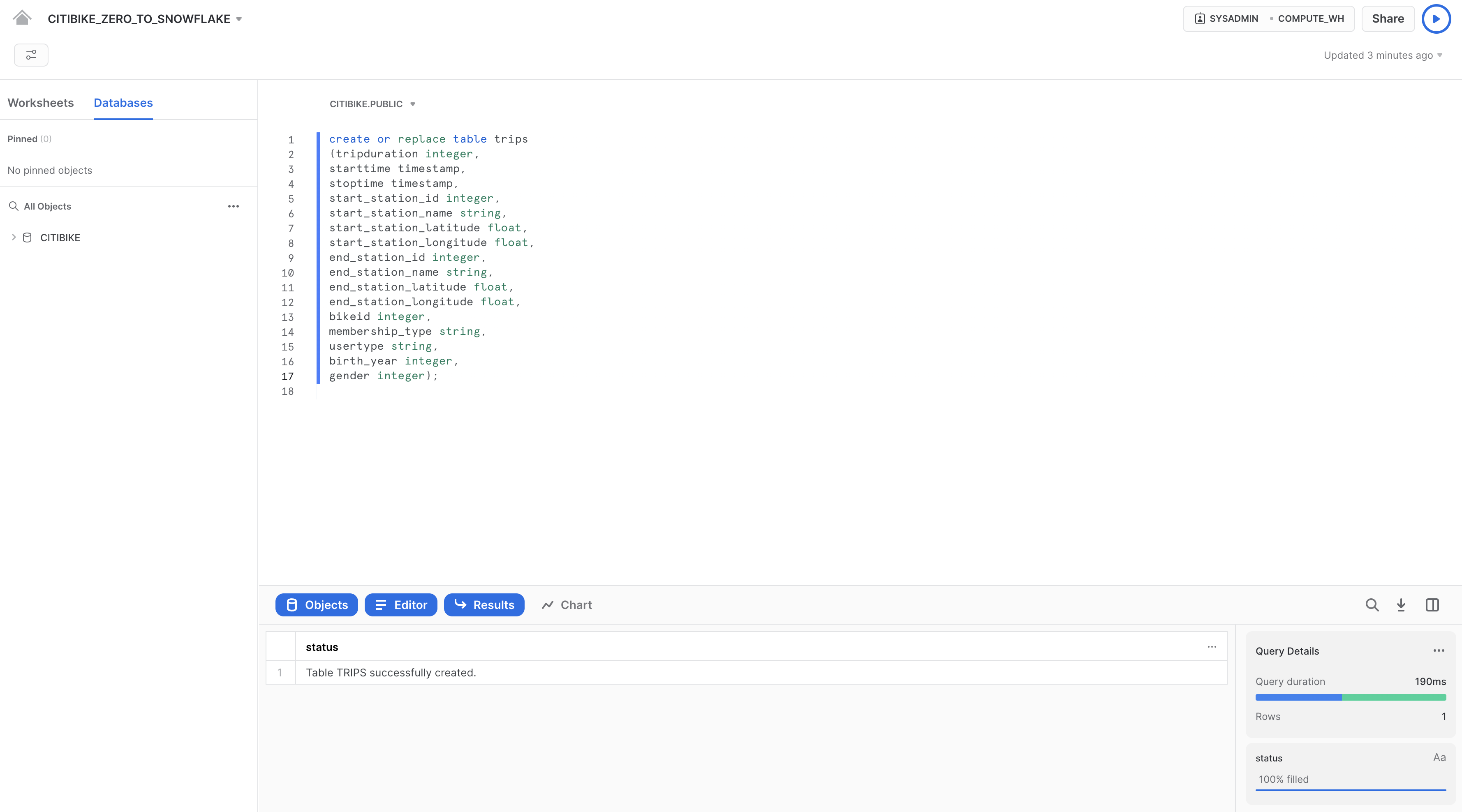 use database citibike; create or replace table trips (tripduration integer, starttime timestamp, stoptime timestamp, start_station_id integer, start_station_name string, start_station_latitude float, start_station_longitude float, end_station_id integer, end_station_name string, end_station_latitude float, end_station_longitude float, bikeid integer, membership_type string, usertype string, birth_year integer, gender integer);