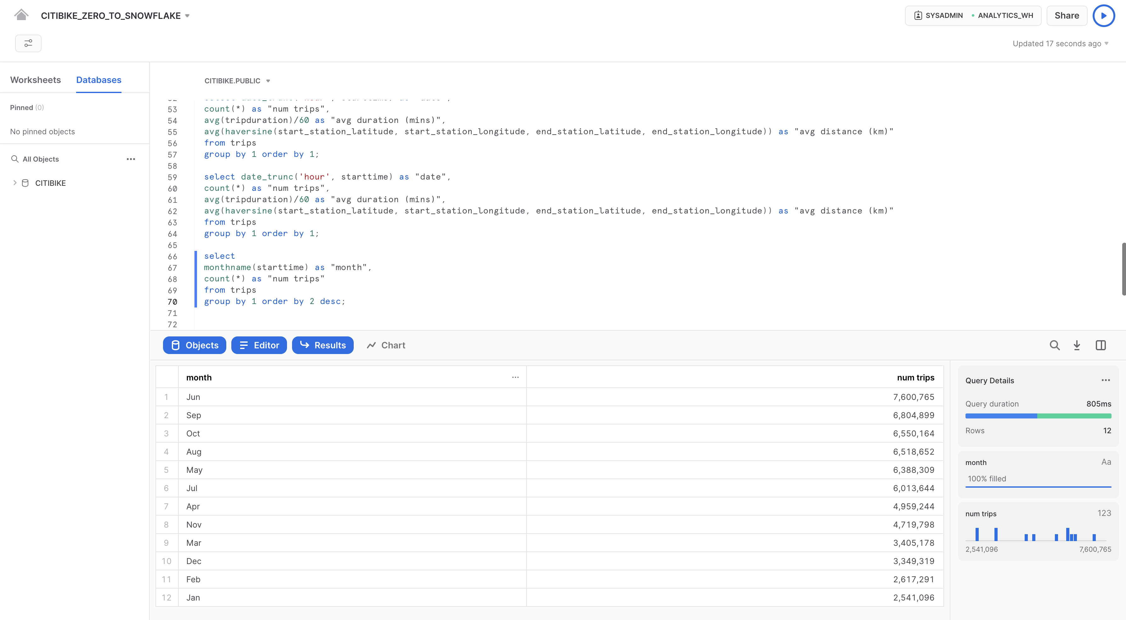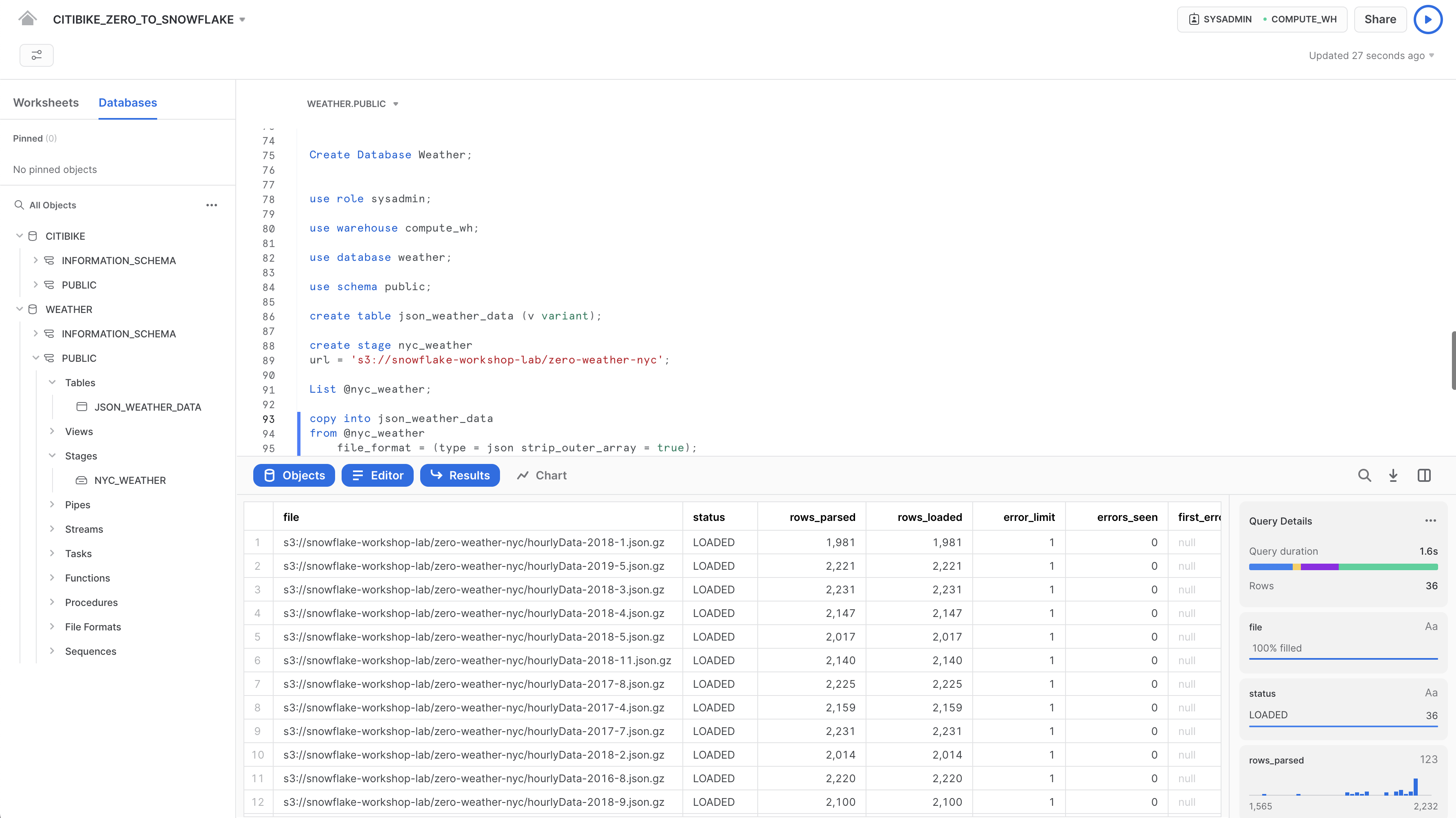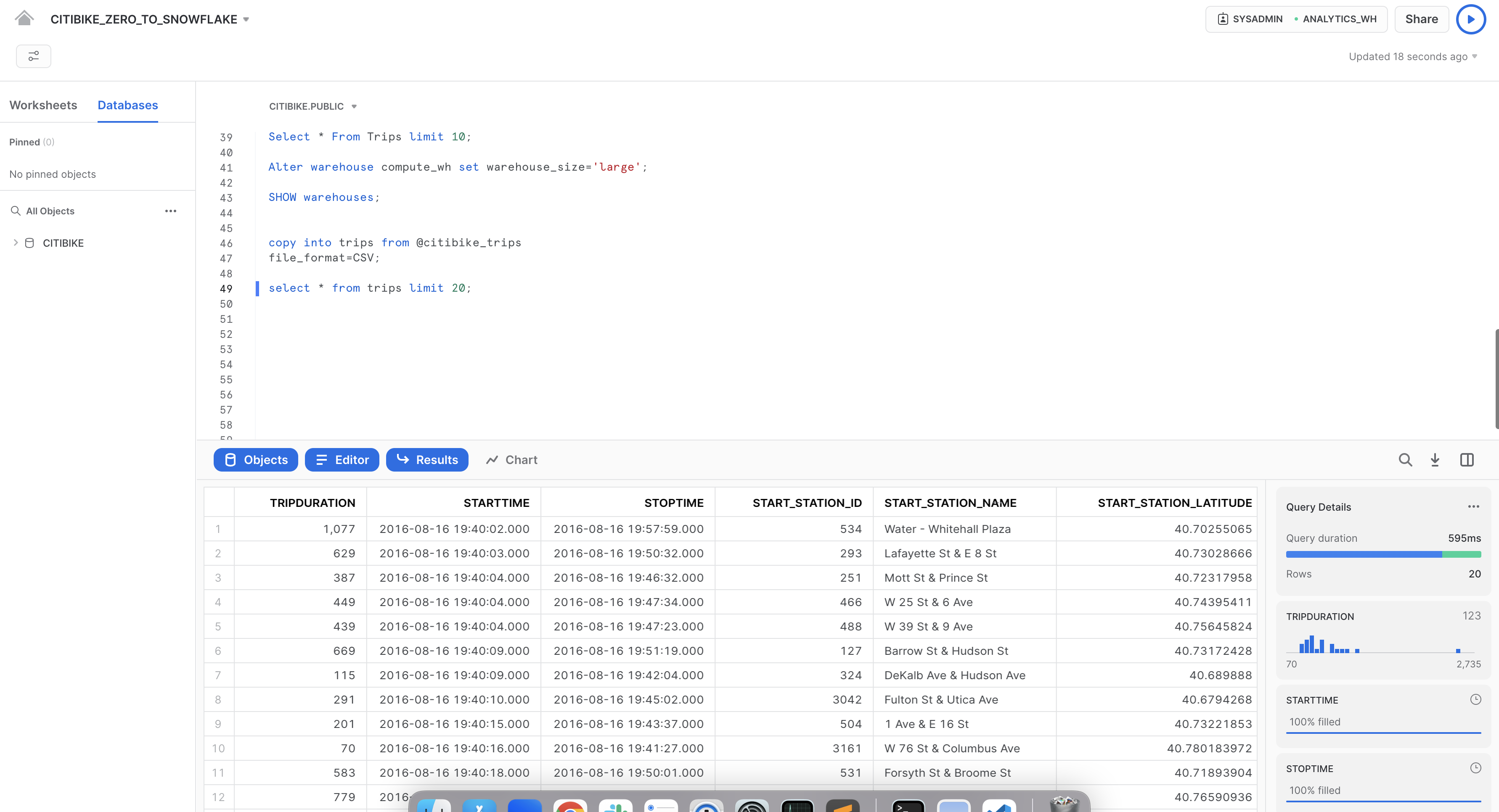 構造化されたCiti Bike利用者のトランザクションデータをSnowflakeにロードする準備から始めましょう。