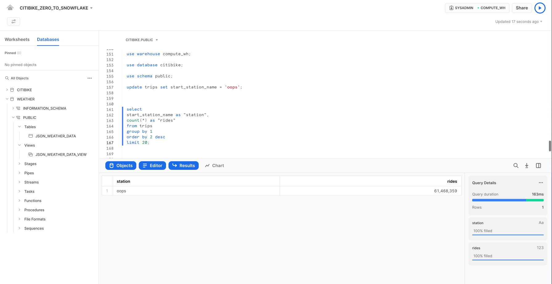 CITIBIKE_ZERO_TO_SNOWFLAKEノートブックで以下のコマンドを実行します。