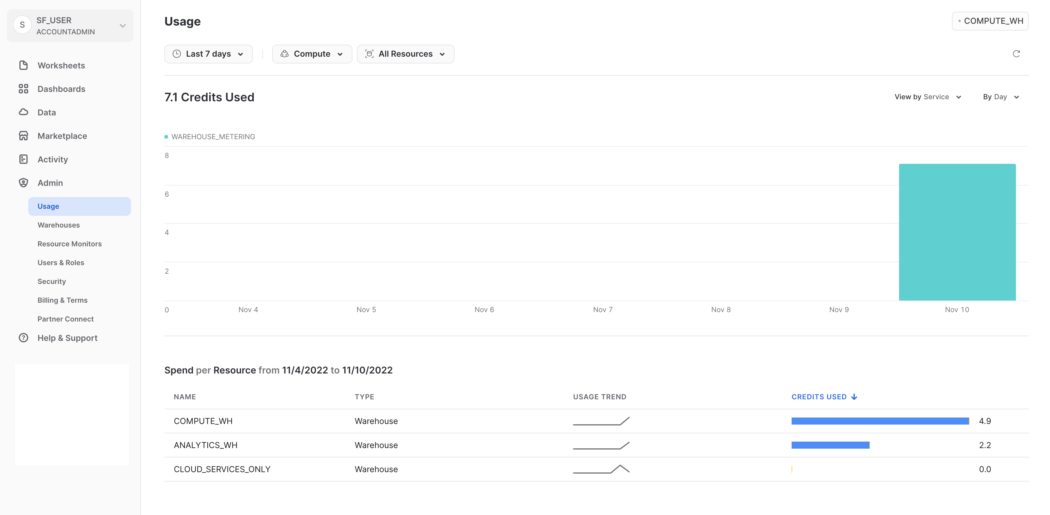 - アカウントの概要(Account Overview):現在のアカウントにおけるクレジット消費の全体像を確認できます。期間で絞り込みながら、ウェアハウスやクエリのコスト傾向を把握できます。