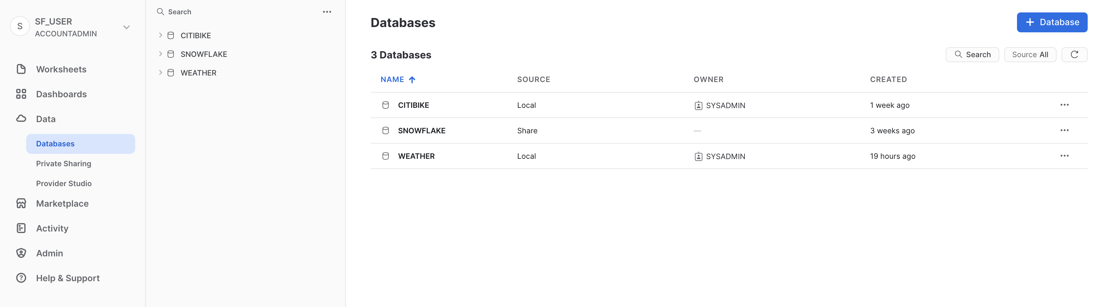 ホームページで、「データ」、「**データベース」**の順に進みます。データベースのリストで、SOURCE列を調べます。この列にLocalと表示されている2つのデータベースがあります。これらは、ラボで先に作成していた2つのデータベースです。もう1つのデータベース、SNOWFLAKEには列にShareの表示がありますが、これは、プロバイダーから共有されていることを示しています。