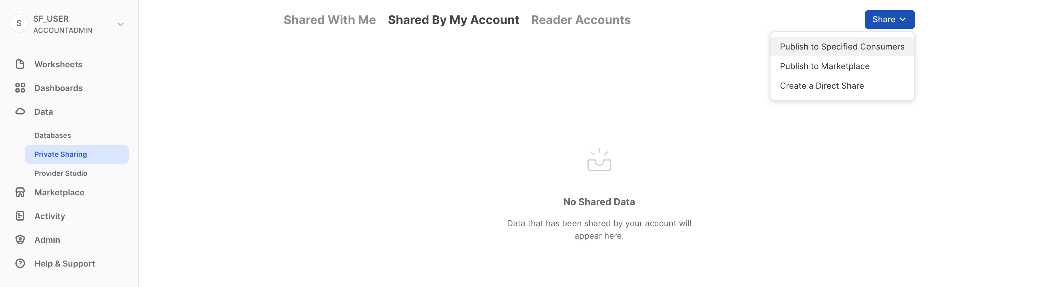 Snowflakeは、安全なデータシェアリング機能を通じて、アカウント間でのデータアクセスを実現します。共有は、データプロバイダーによって作成され、データコンシューマーにより、自身のSnowflakeアカウントまたはプロビジョニングされたSnowflakeリーダーアカウントを通じてインポートされます。コンシューマーは、外部エンティティの場合もあれば、独自のSnowflakeアカウントを持つ必要がある社内の部門である場合もあります。