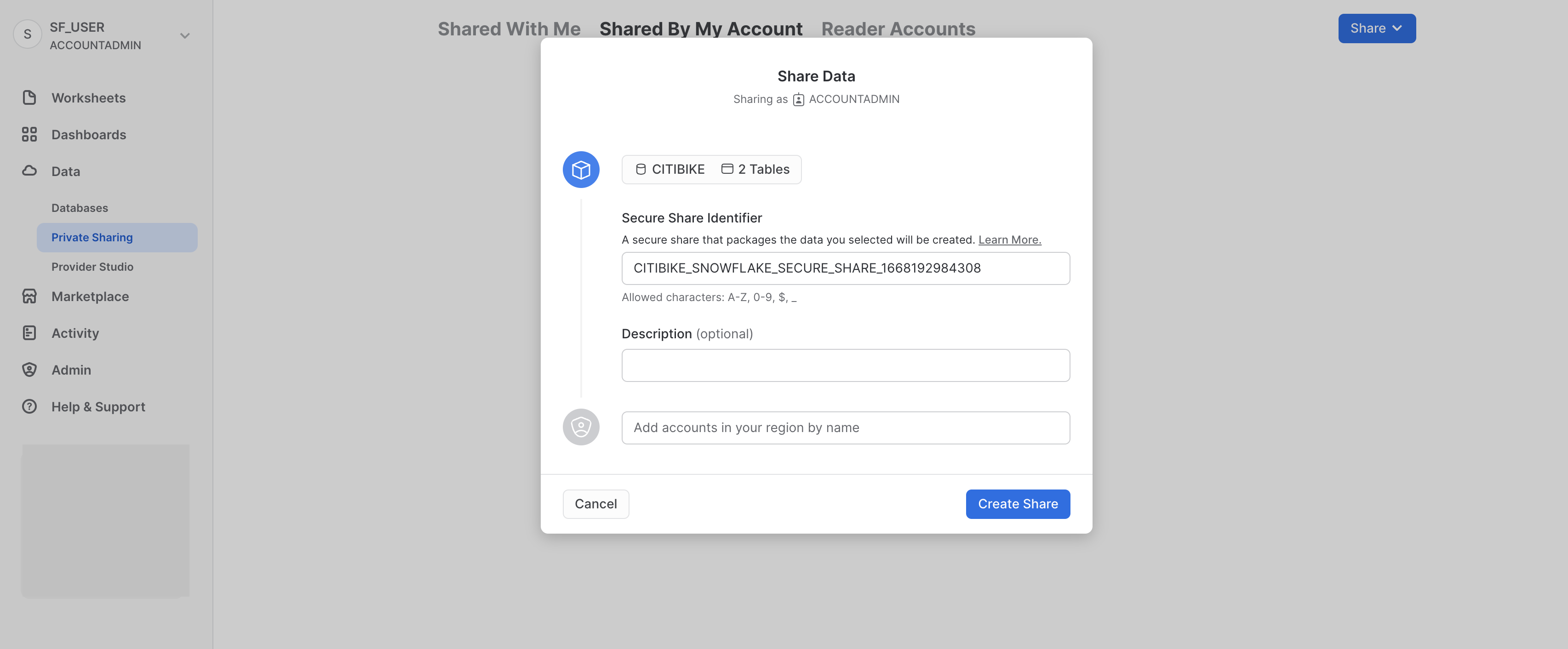 共有のデフォルト名は、ランダムな数値を付加した一般的な名前となっています。デフォルト名を編集し、将来的に共有を識別するのに役立つわかりやすい名前に変更します(ZERO_TO_SNOWFLAKE_SHARED_DATAなど)。コメントを追加することもできます。