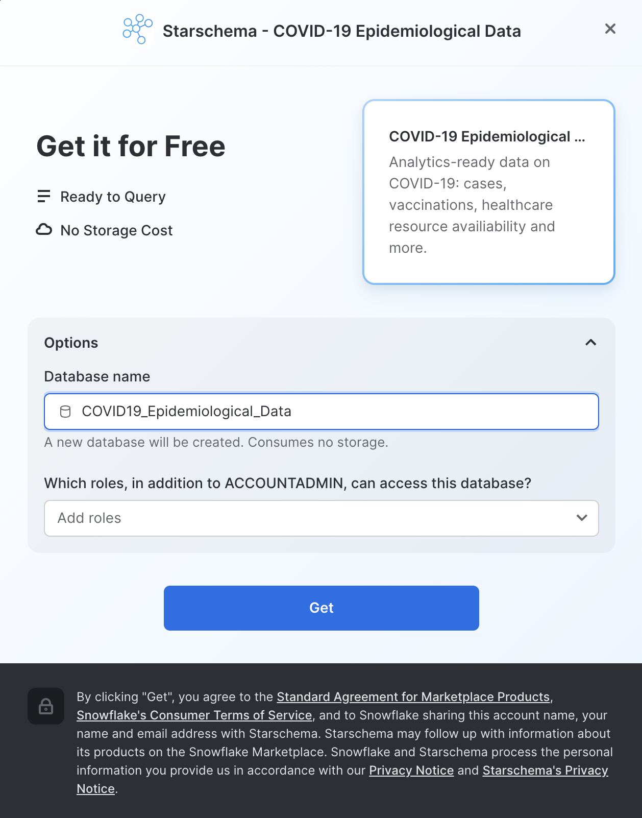 COVID-19疫学データのページでは、データセットの詳細や、クエリの使用例を見ることができます。準備ができたら、「取得」ボタンをクリックします。そうすることで、この情報を自分のSnowflakeアカウント内で利用できるようになります。