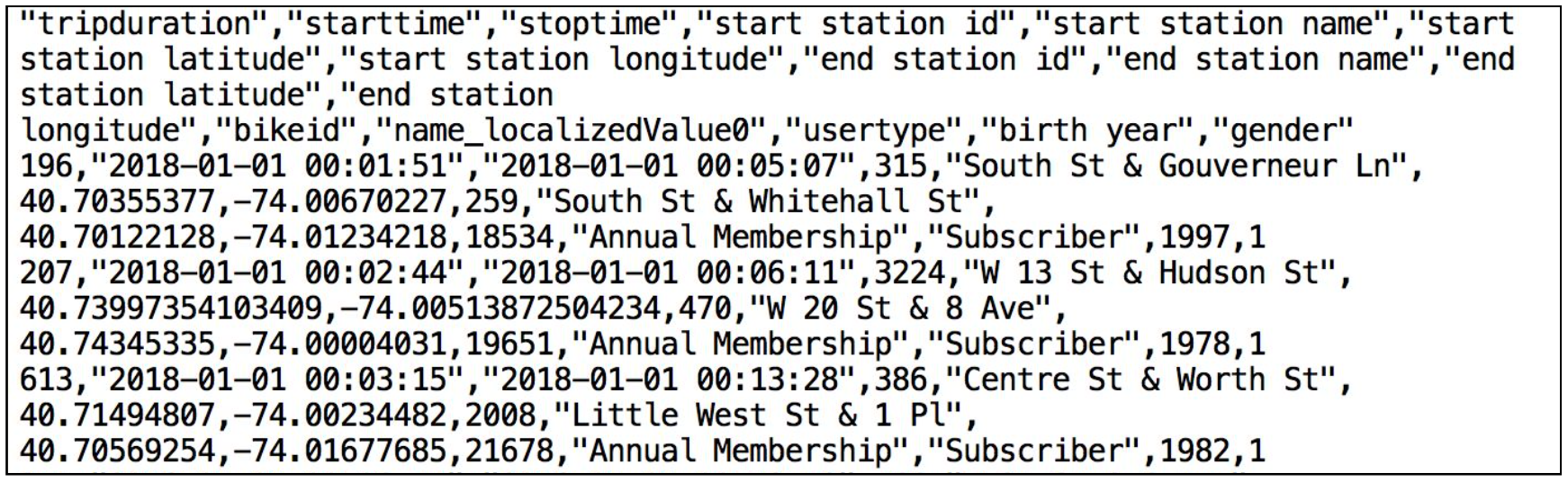 以下は、Citi Bike(CSV)データファイルのスニペットです。