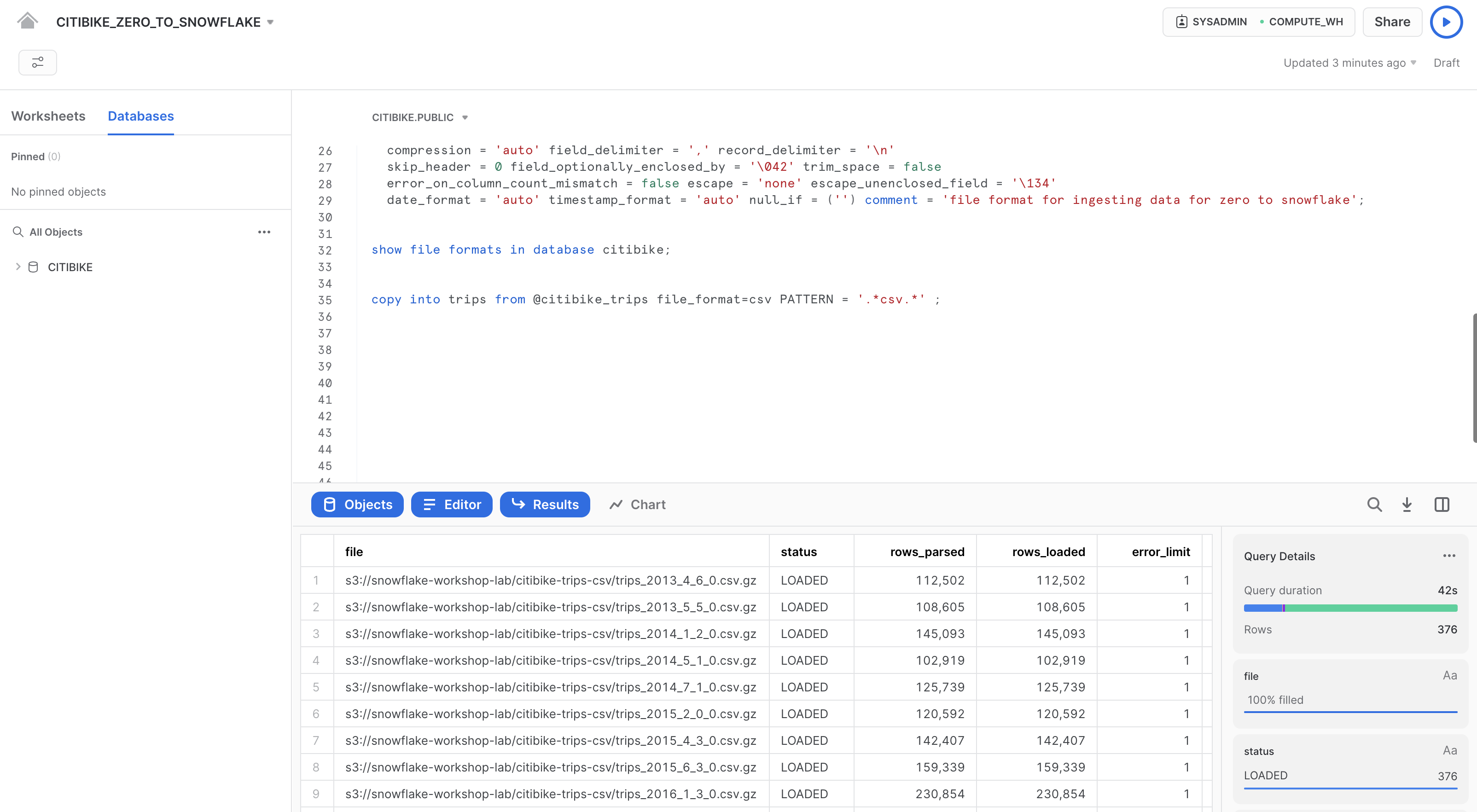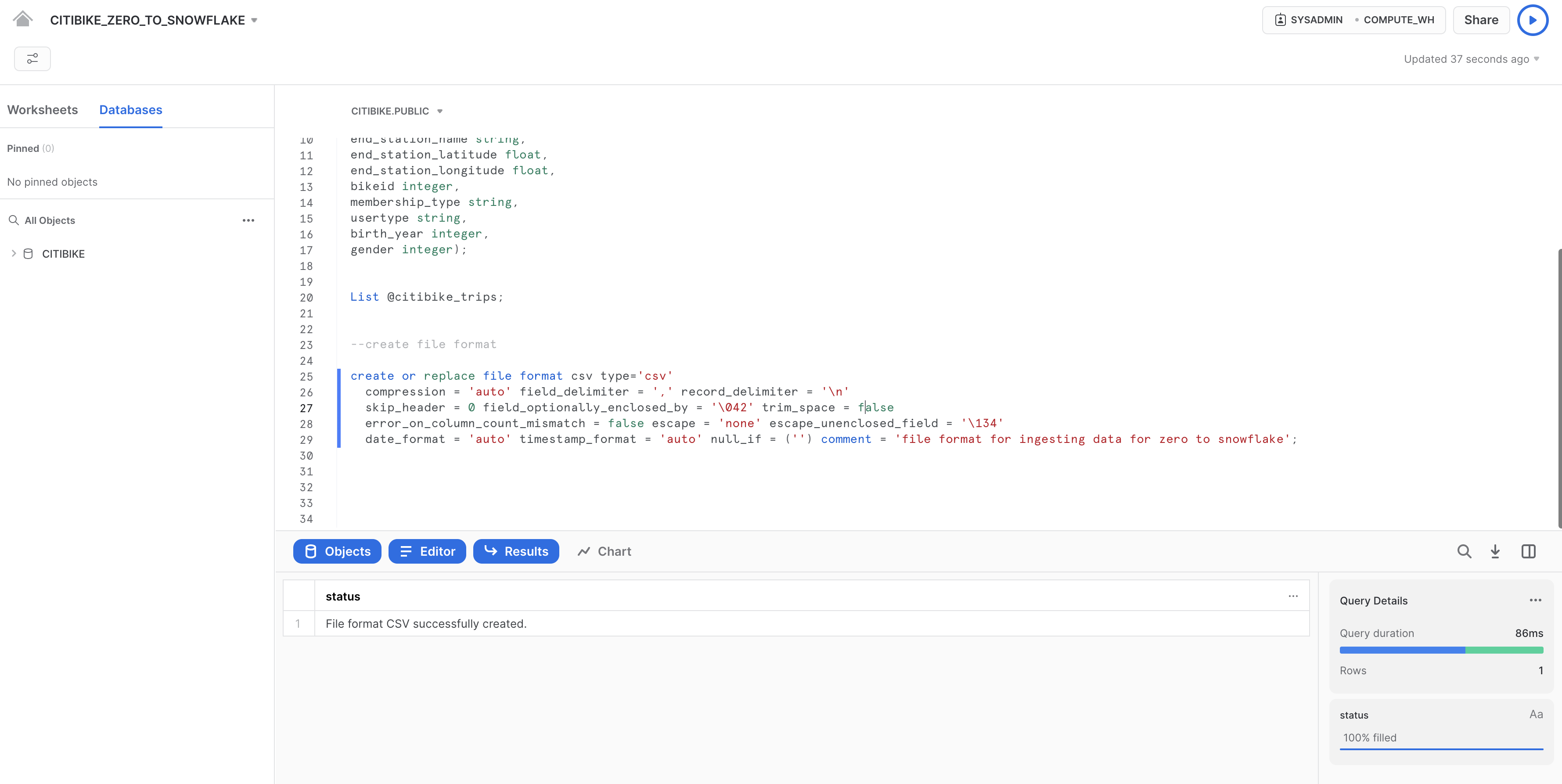 構造化されたCiti Bike利用者のトランザクションデータをSnowflakeにロードする準備から始めましょう。