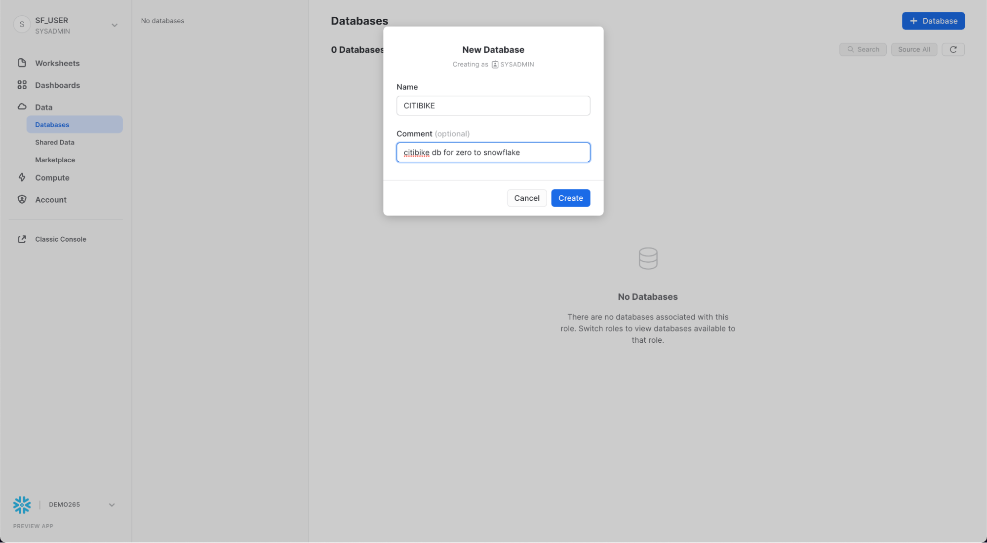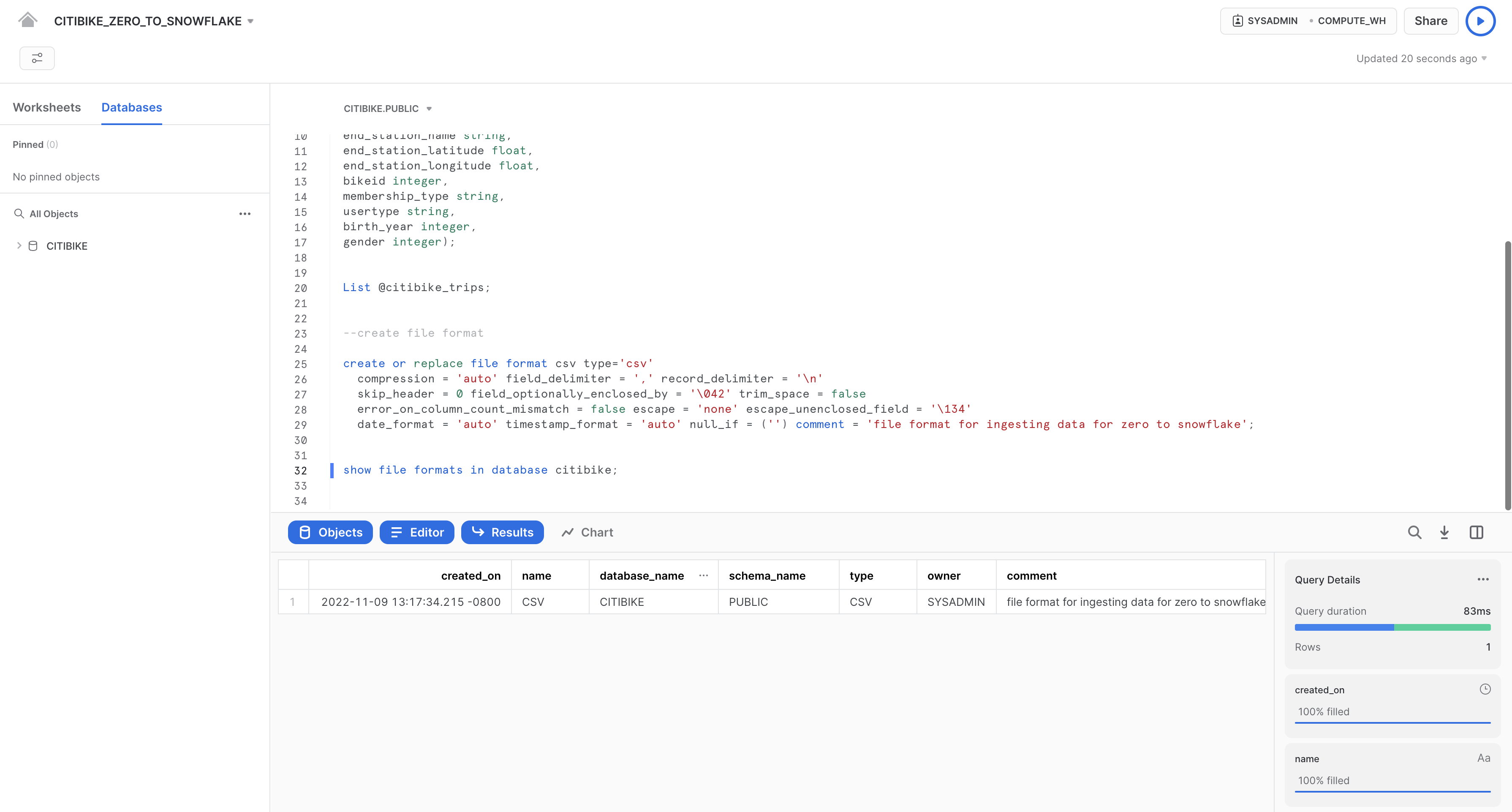 まず、構造化データのロードに使用するCITIBIKEという名前のデータベースを作成しましょう。