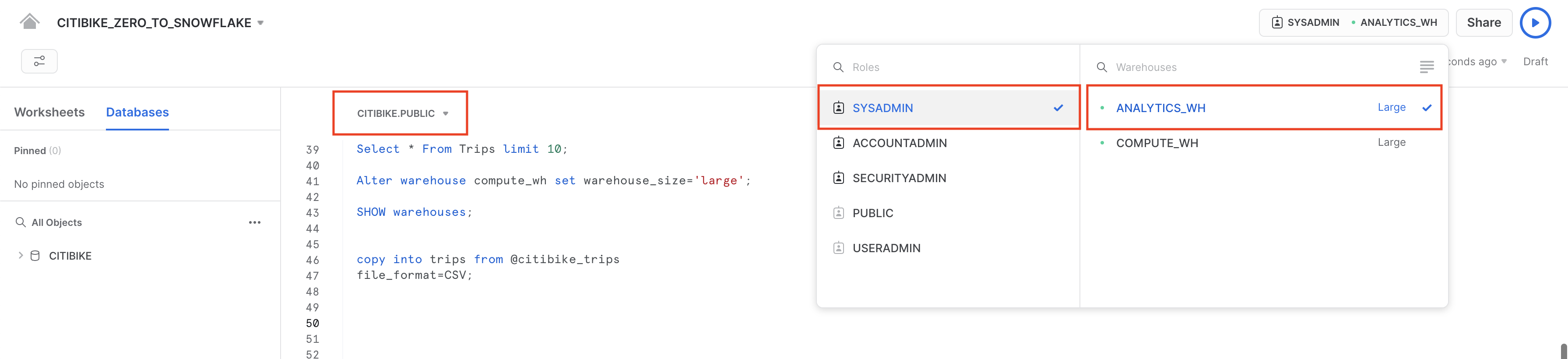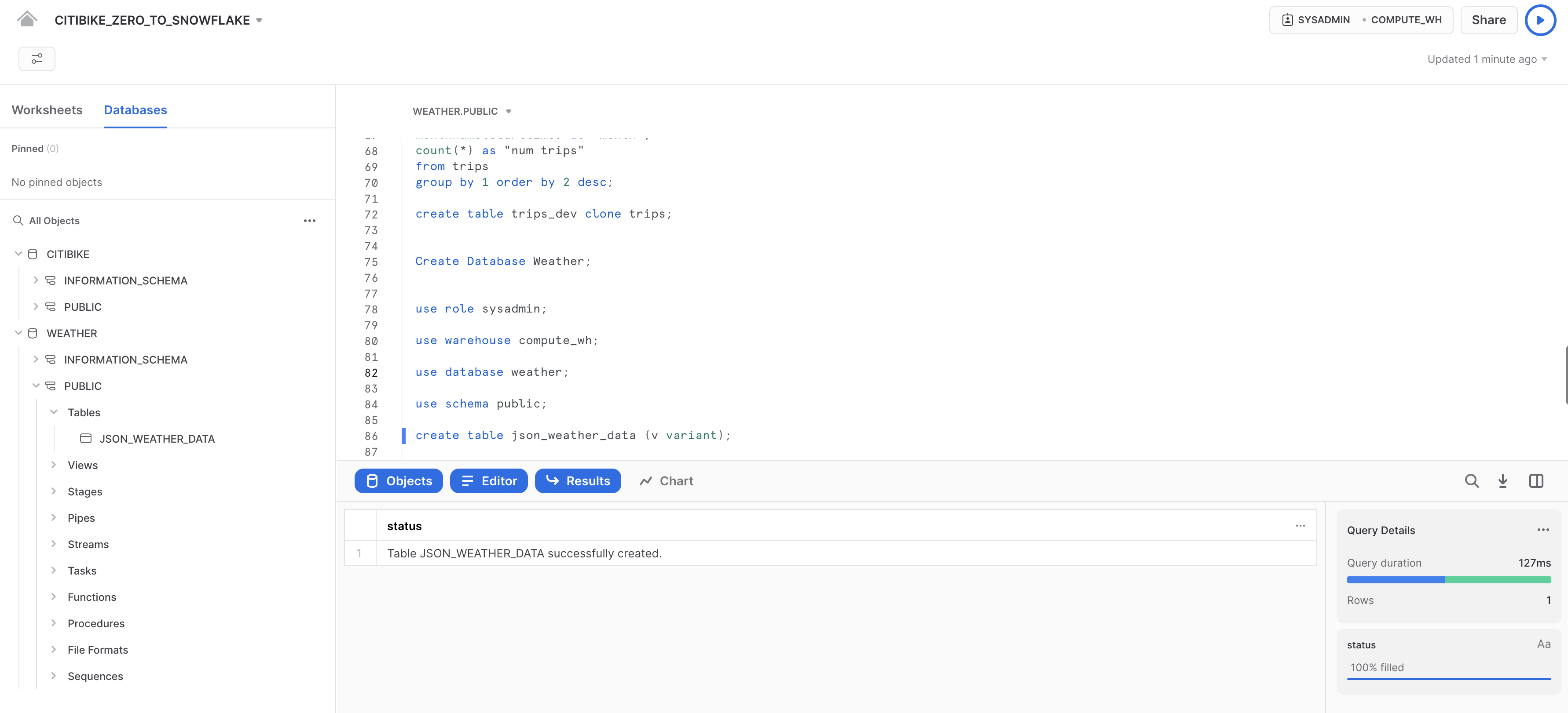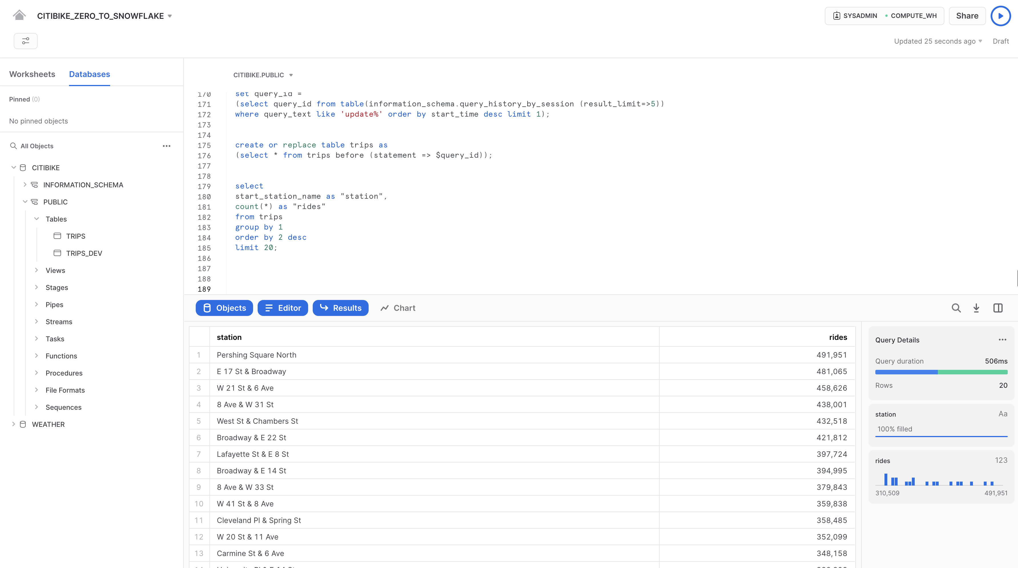 CITIBIKE_ZERO_TO_SNOWFLAKEノートブックで以下のコマンドを実行します。