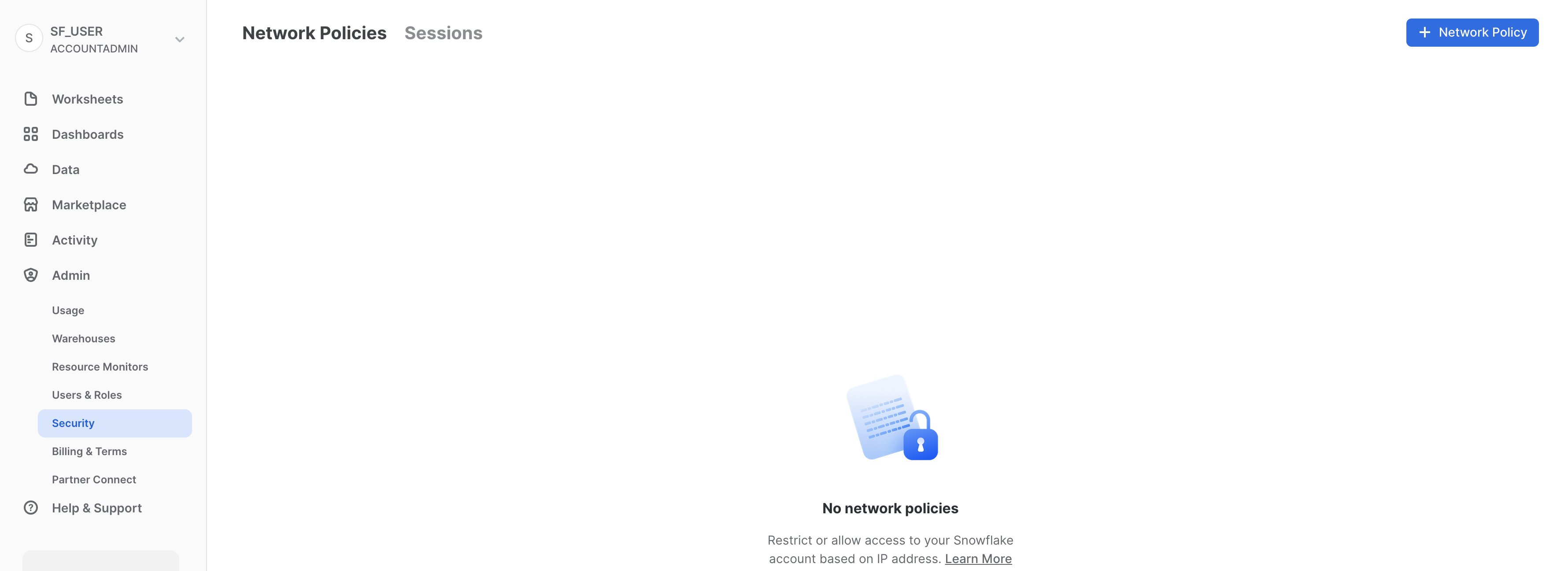 「セキュリティ」タブには、Snowflakeアカウント用に作成されたネットワークポリシーが含まれています。新しいネットワークポリシーは、ページの右上にある「+ネットワークポリシー」を選択して作成できます。
