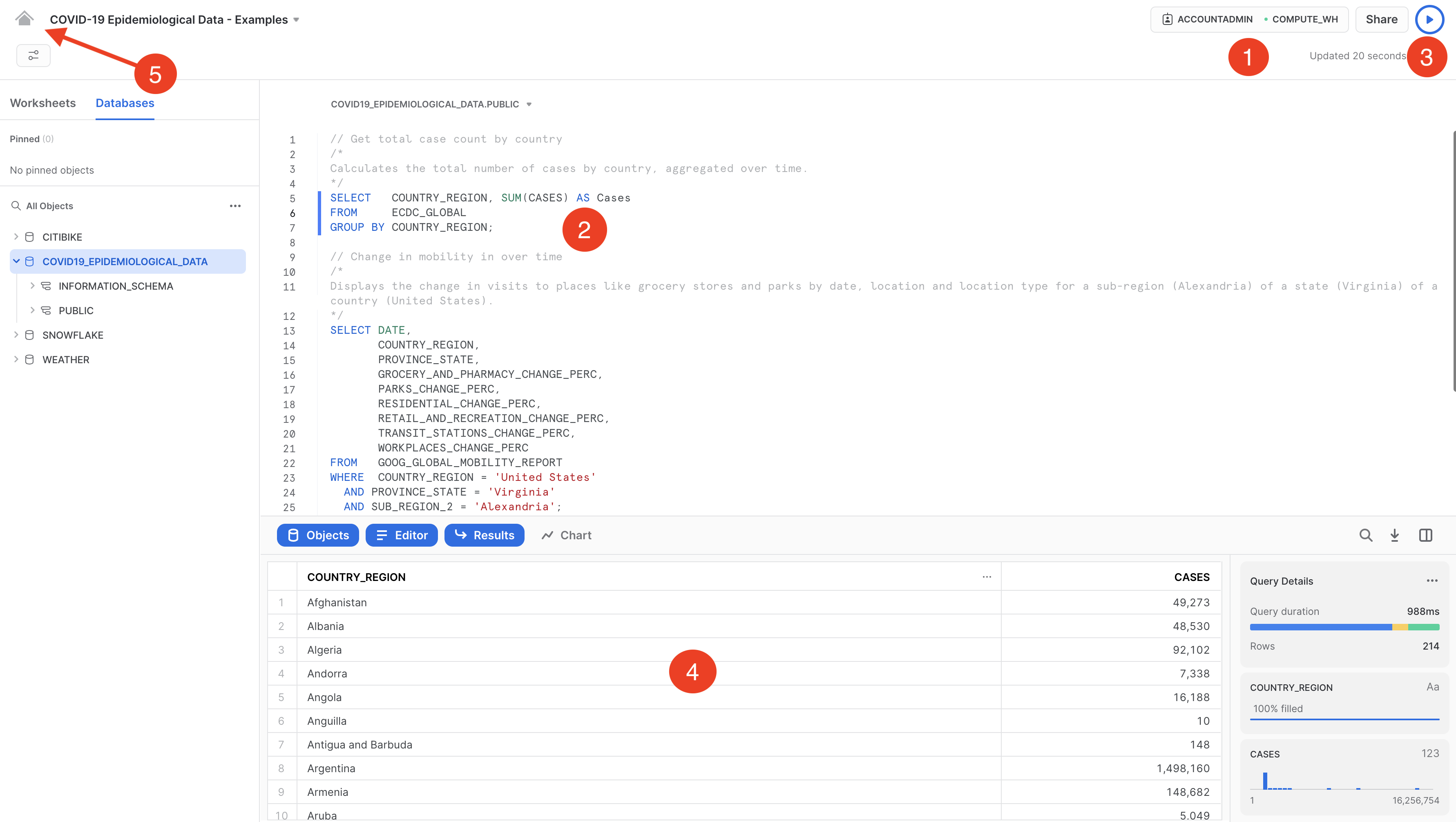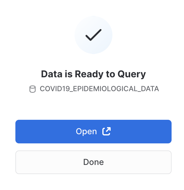 これで完了です。これで、Starschema提供のCOVID-19データセットのサブスクライブが問題なく完了しました。このデータセットは、世界的なCOVIDのデータにより毎日更新されます。データベース、テーブル、ビュー、ETLプロセスを作成する必要がなかったことに注意してください。Snowflakeマーケットプレイスの共有データを検索し、アクセスするだけでした。