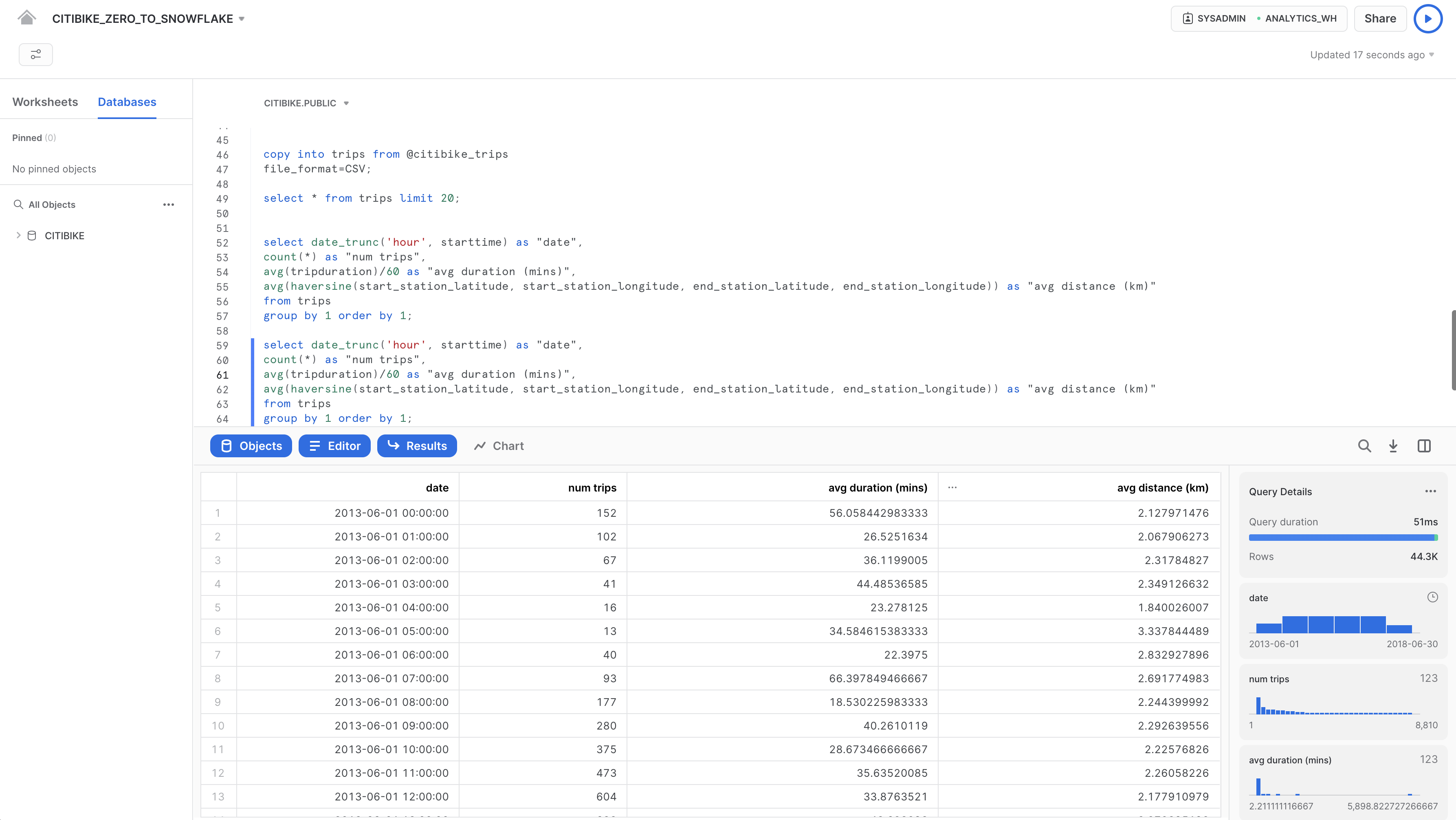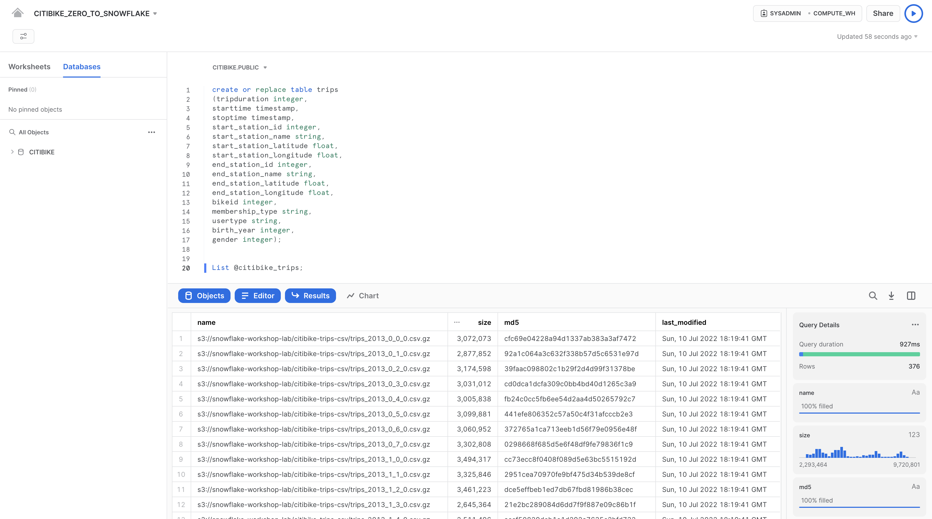 構造化されたCiti Bike利用者のトランザクションデータをSnowflakeにロードする準備から始めましょう。