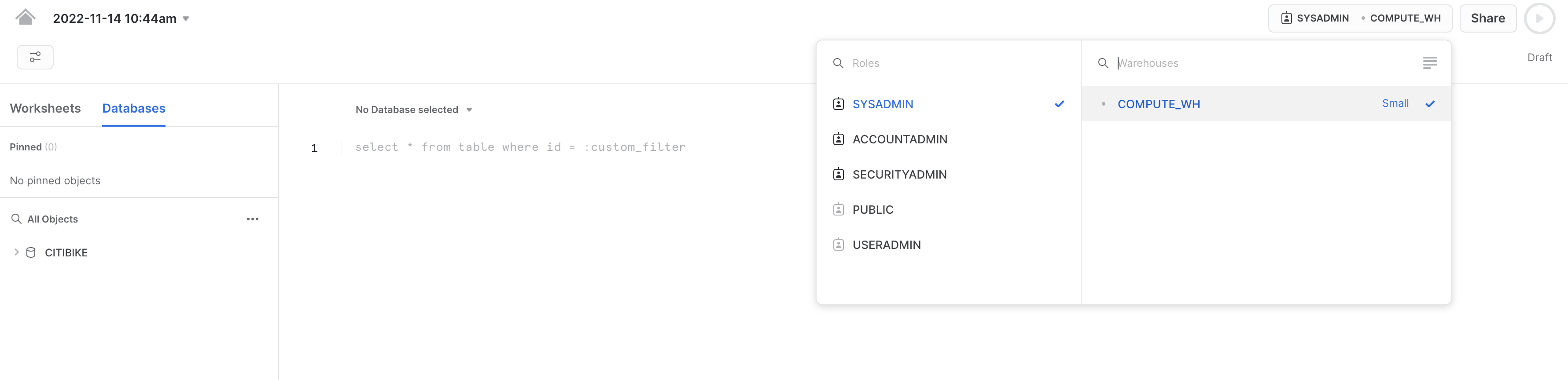 また、新しく作成されたロールにはウェアハウスの使用権限がないため、ウェアハウスは選択されていません。ADMINロールに戻し、COMPUTE_WHウェアハウスの使用権限を付与することで、この問題を解決しましょう。