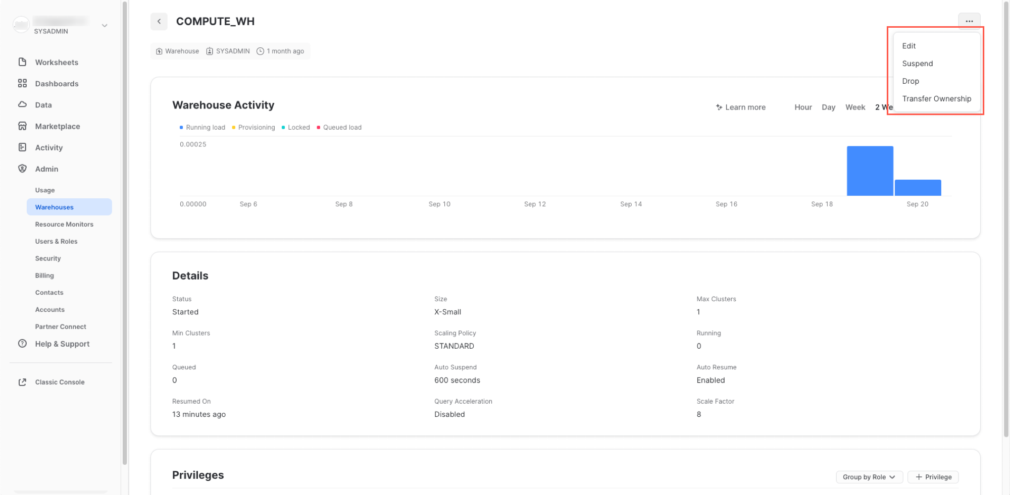 - 消費:現在のアカウントの仮想ウェアハウスによって消費されたクレジットです。