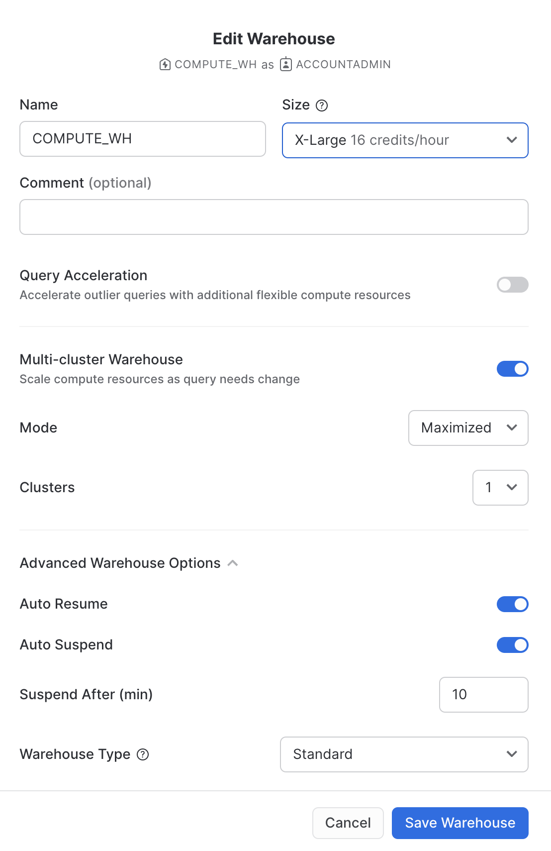 ロール:SYSADMINウェアハウス:COMPUTE_WH