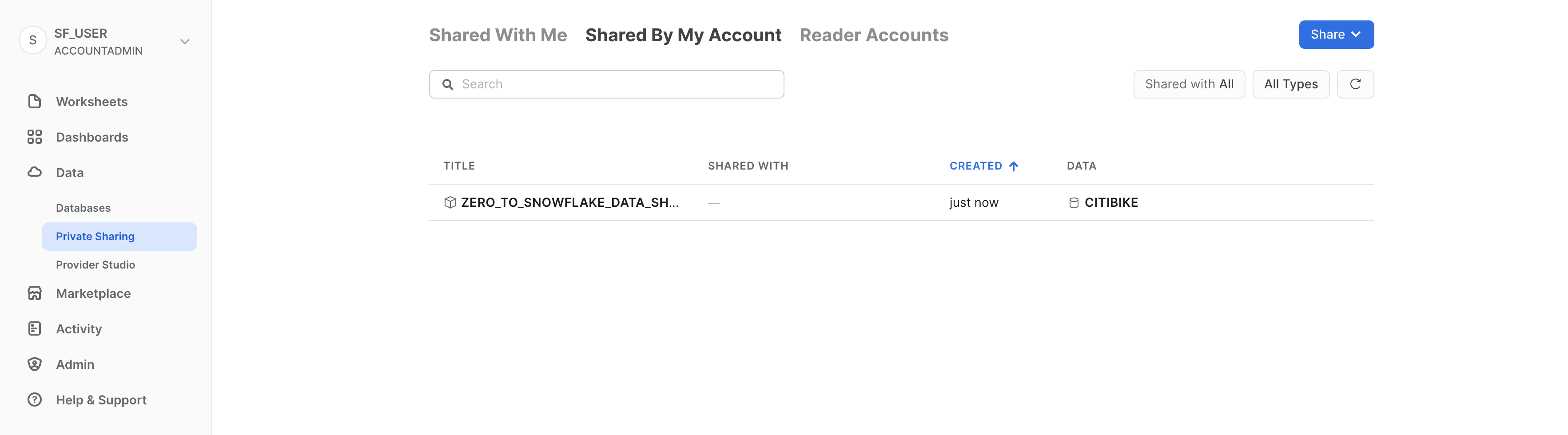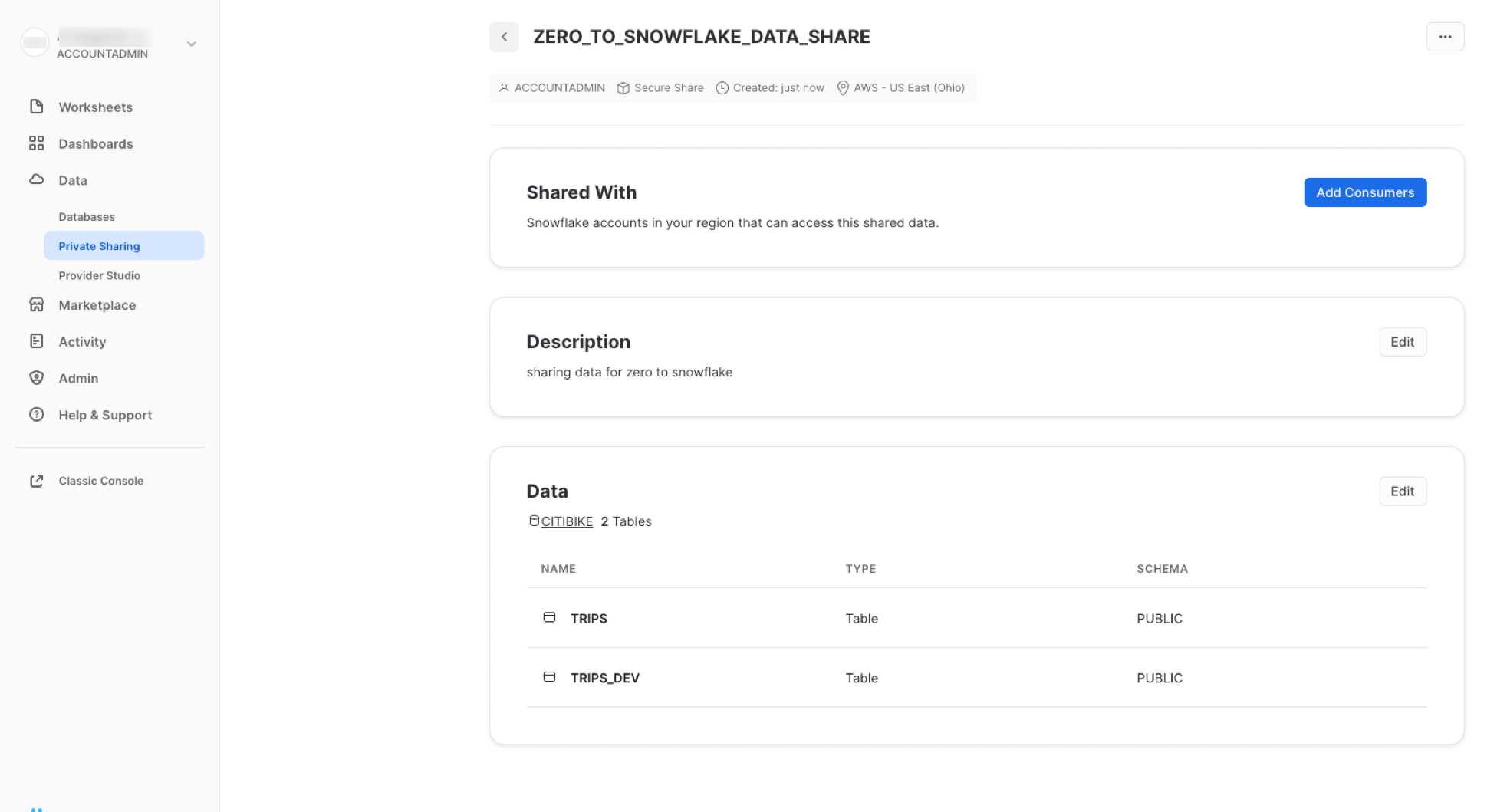 実際のシナリオでは、次に、Citi Bikeのアカウント管理者が1つ以上のコンシューマーアカウントを共有に追加することになると思いますが、今回のラボではそこまでは実行しません。