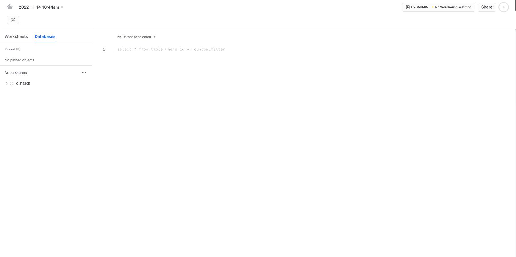 ノートブックでの作業をしやすくするために、名前を変更しましょう。中央上にあるタブノートブックのタブをダブルクリックし、CITIBIKE_ZERO_TO_SNOWFLAKEに変更します。
