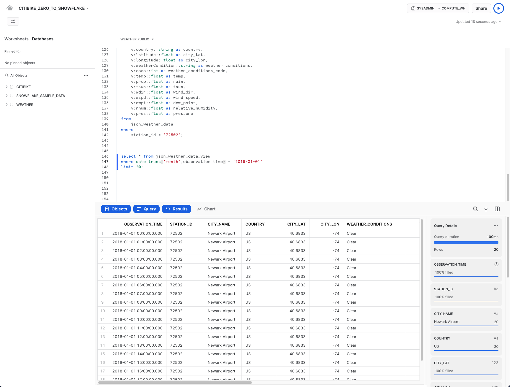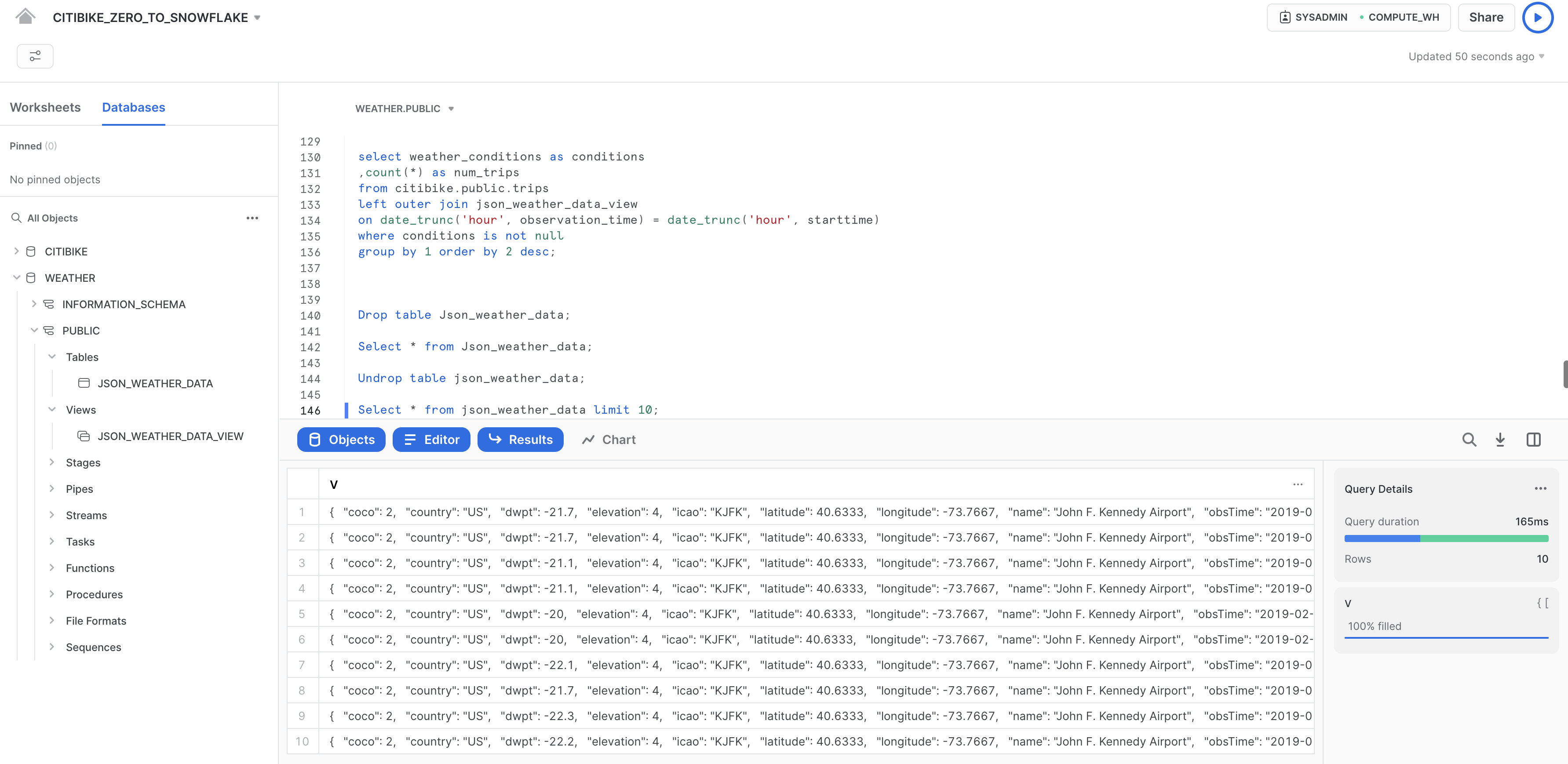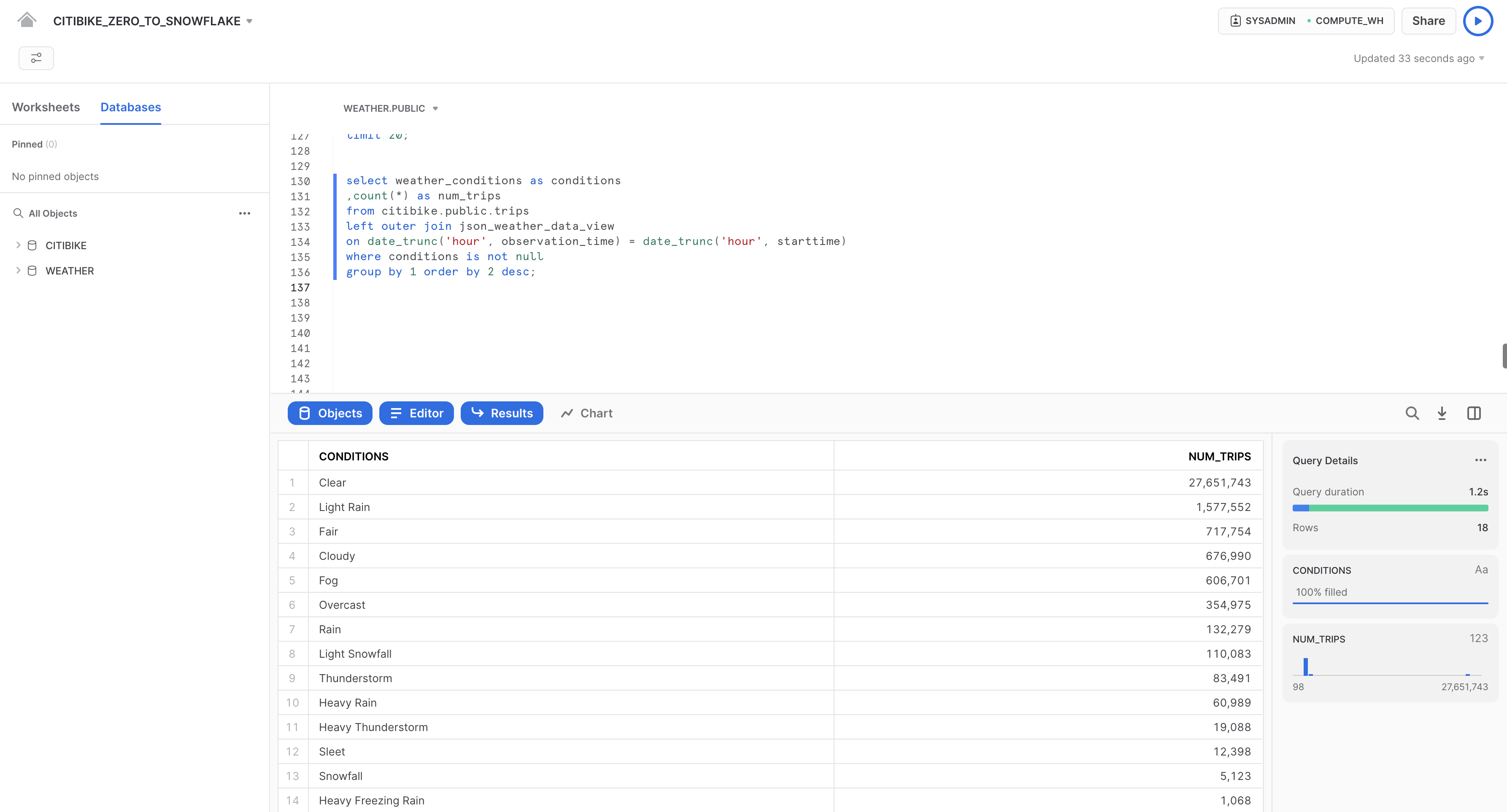 まず私たちは、自転車利用者のトランザクションから得られた構造化された.csvデータをSnowflakeにロードします。その後、オープンソースの半構造化JSON気象データを利用して、自転車の利用回数と天候に相関関係があるかを判断していきます。