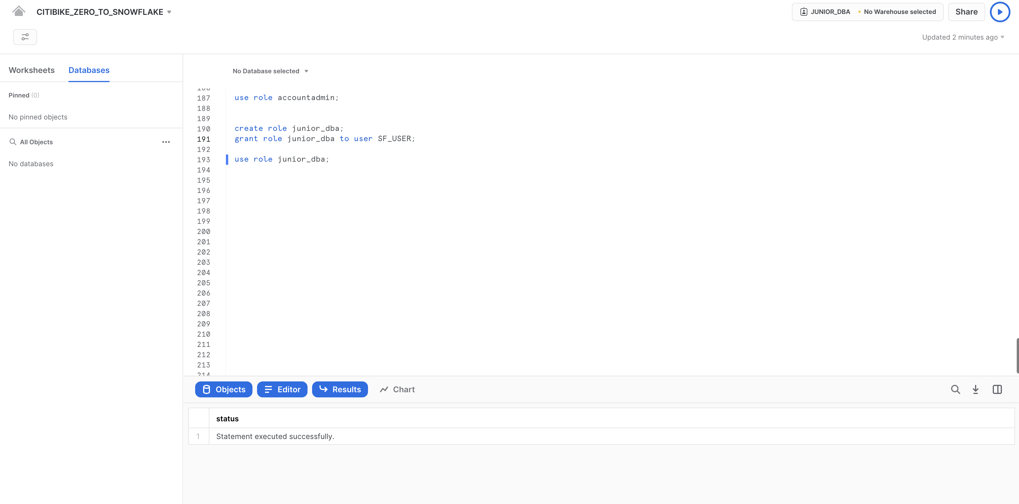 use role accountadmin; grant usage on database citibike to role junior_dba; grant usage on database weather to role junior_dba;