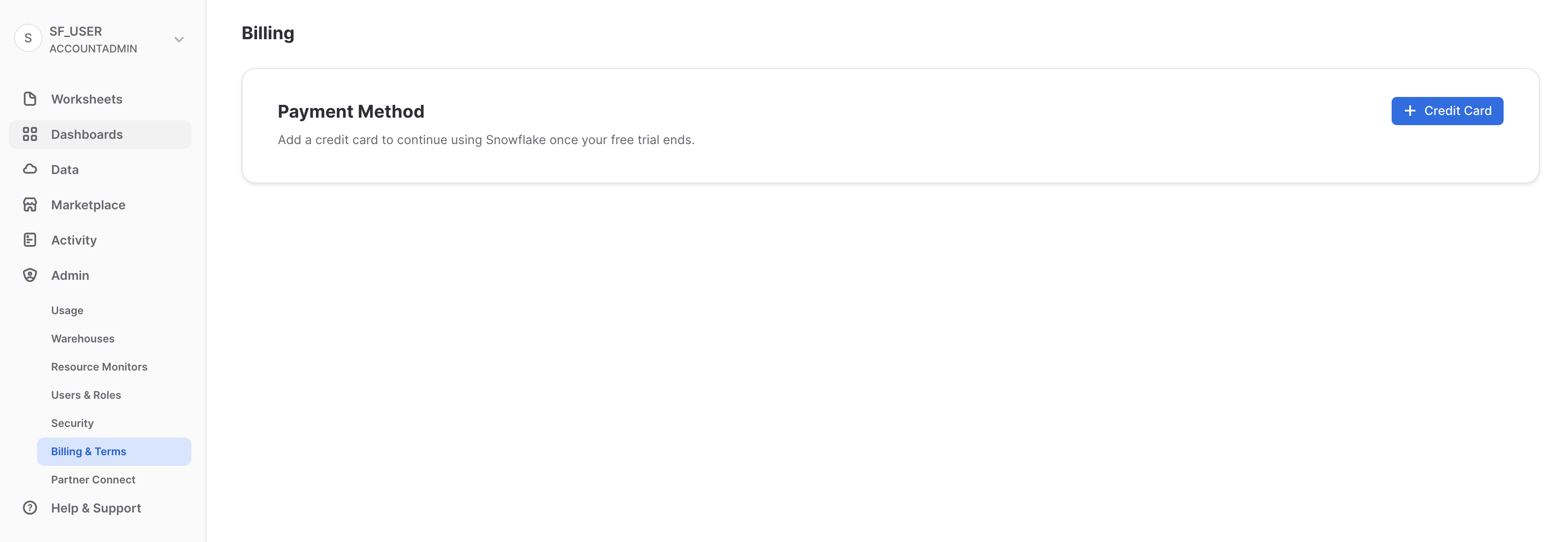 - オンデマンドのSnowflakeユーザーで、月々のお支払いに使用するクレジットカード情報が登録されている場合は、このタブにそのクレジットカード情報が表示されます。クレジットカードが登録されていない場合、トライアル終了時にクレジットカード情報を追加することで、引き続きSnowflakeをご利用いただくことができます。